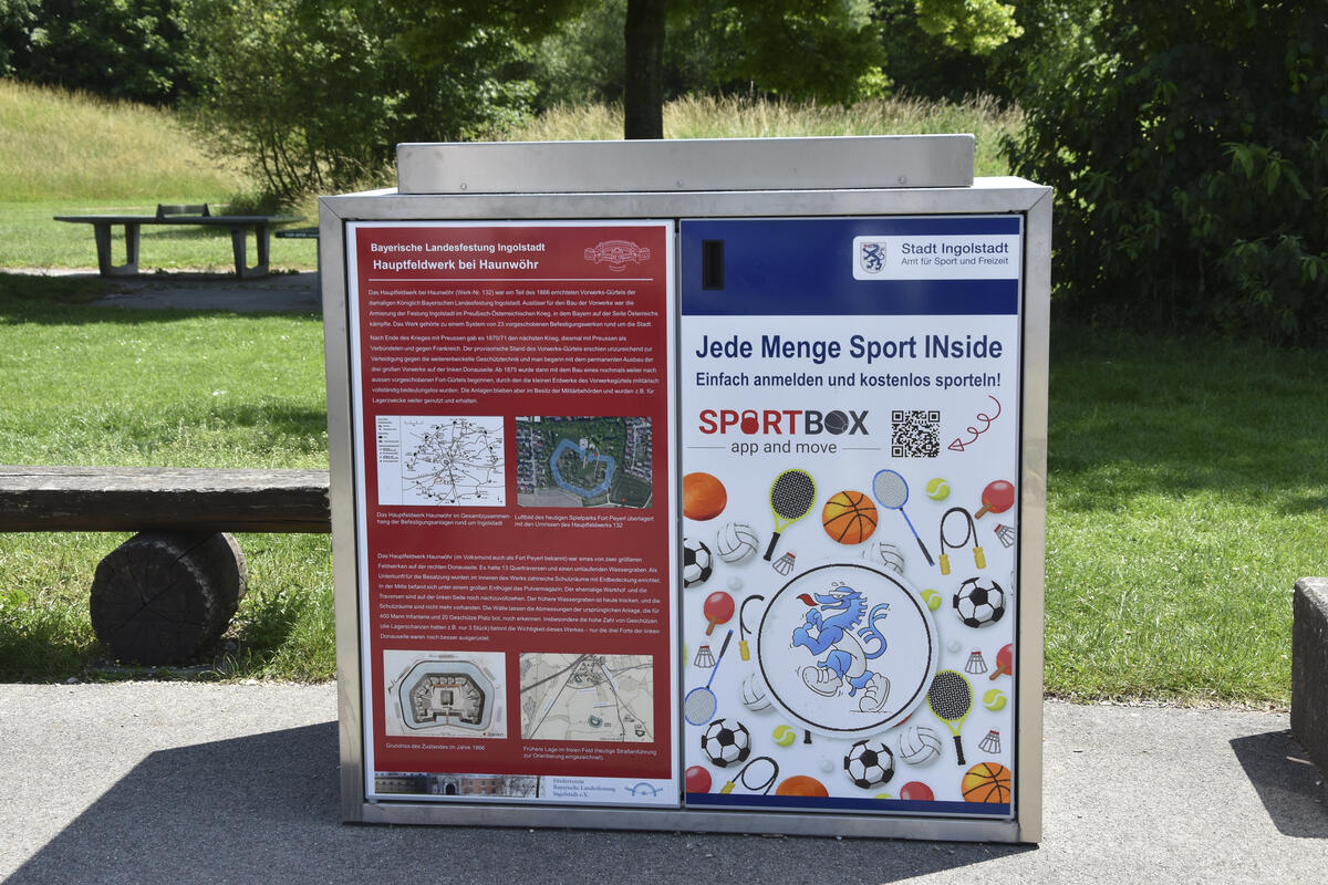 Ein neues Sport- und Spielangebot in Ingolstadt: Die SportBox im Fort Peyerl bietet die Möglichkeit, Sport- und Spiele-Equipment per App auszuleihen. Sie befindet sich in der Nähe der Spielflächen Tischtennisplatte, Skateanlage bzw. mit den Koordinaten 48.736470,11.411410.