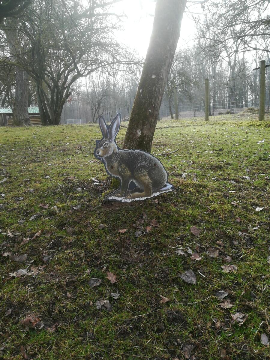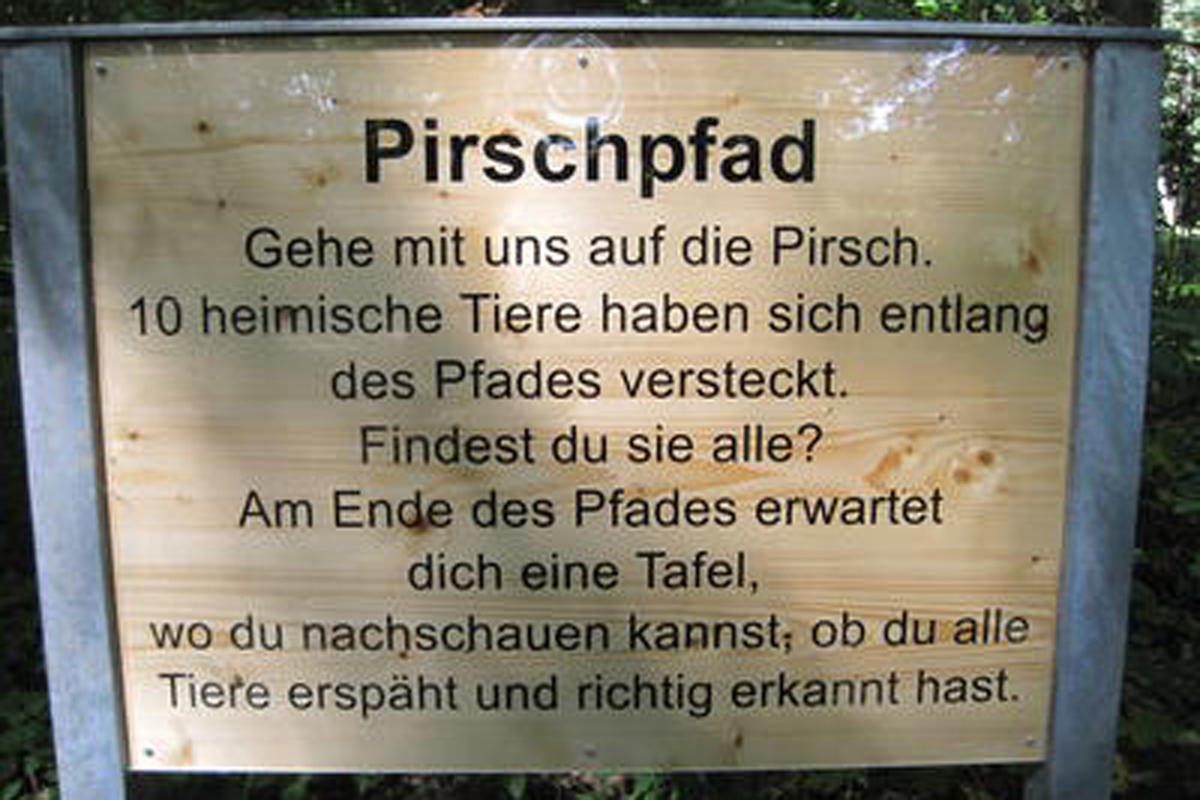 Hier können sich kleine und große Besucher auf die Pirsch nach zehn heimischen Tierarten begeben. Am Ende des Pfades befindet sich eine Tafel, die auflöst, welche Waldbewohner sich versteckt haben.