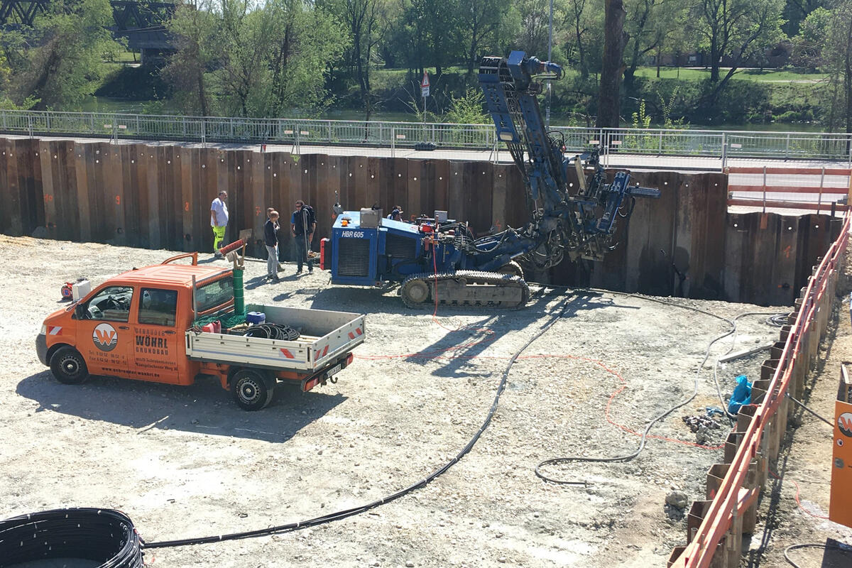 Im Bereich des späteren Gebäudeteils C (Hochpunkt mit Panoramarestaurant) wird im Rahmen der Erdarbeiten eine teilweise rückverankerte Spundwand als Baugrubenverbau eingebracht.