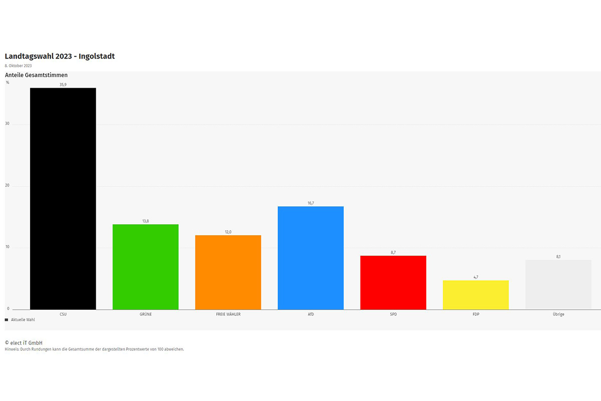 Bei der Landtagswahl liegt in Ingolstadt die CSU vor der AfD und den Grünen. Es folgen die Freien Wähler, SPD und FDP. Bei den Erststimmen-Kandidaten erzielt Alfred Grob (CSU) die meisten Stimmen vor Lukas Rehm (AfD) und Merlin Nagel (Grüne). Die Wahlbeteiligung lag bei 63,6 Prozent. Bei der Landtagswahl 2018 stimmten 64,9 Prozent der Wahlberechtigten ab. Die Möglichkeit der Briefwahl nutzten 32.980 Personen, das sind 39 Prozent mehr als bei der letzten Landtagswahl.