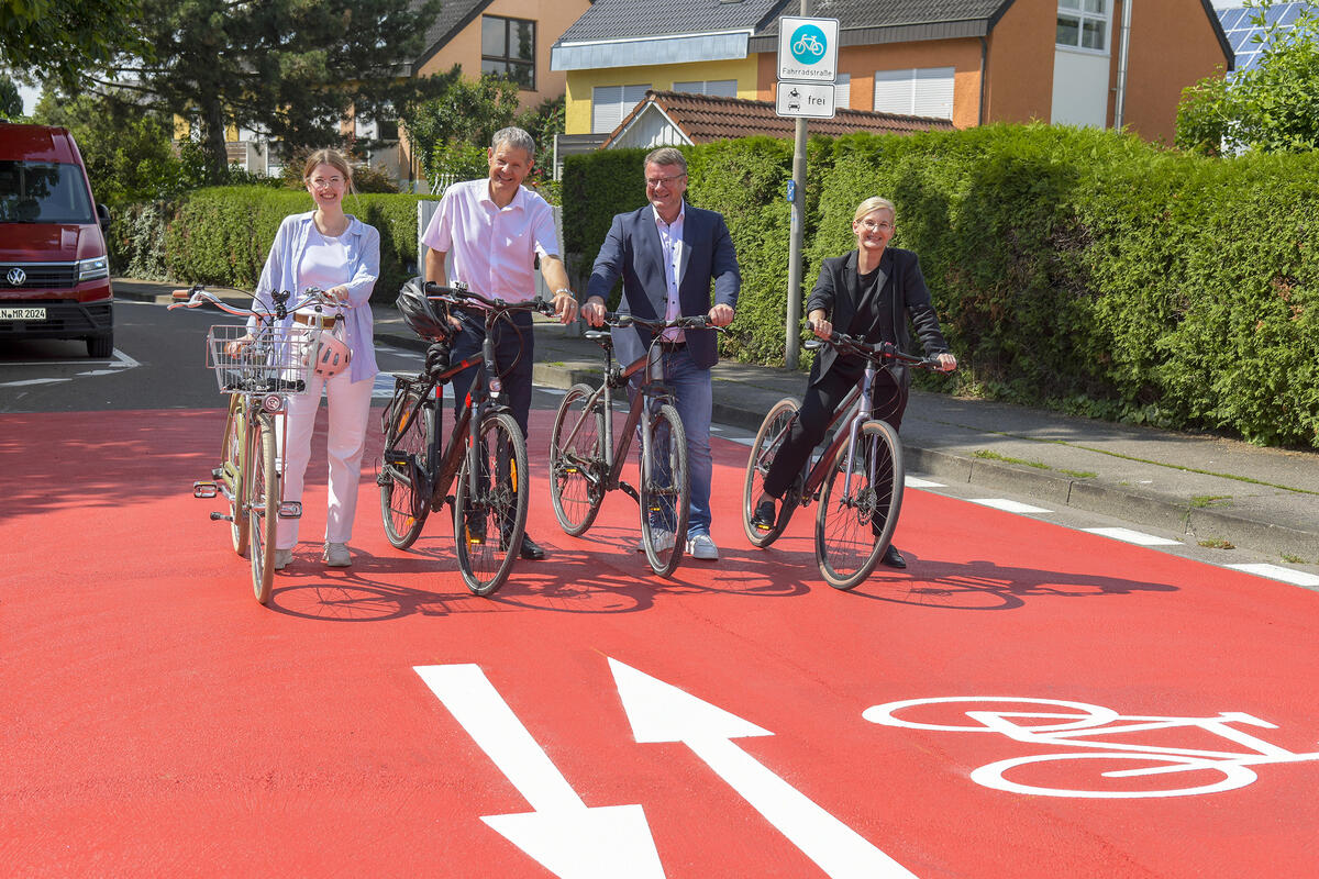 Riesige Piktogramme auf der Straße und eine rote Markierung: Die Fahrradstraßen in Ingolstadt werden deutlicher sichtbar. Die ersten Straßen (Adam-Smith-Straße, Samhofer Weg und Steigerwaldstraße) wurden vor kurzem fertig gestellt. Zusätzlich ist die kleine Neuburger Straße als Fahrradstraße ausgewiesen und nach den Empfehlungen markiert worden. Zuletzt wurde die neugestaltete Fahrradstraße im Samhofer Weg durch Stadtbaurätin Ulrike Wittmann-Brand, Baureferent Gero Hoffmann, die Fahrradbeauftragte Theresa Schneider und den Leiter des Amts für Verkehrsmanagement und Geoinformation Ulrich Schäpe eröffnet. „Wir freuen uns, dass die Fahrradstraßen nun für alle besser erkennbar sind“, so Schneider.