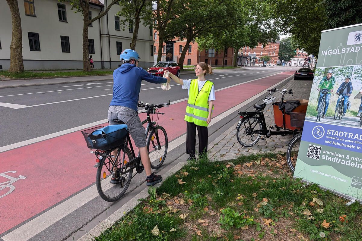 Dabei verteilten die Fahrradbeauftragte der Stadt Ingolstadt Theresa Schneider und ihr Kollege Volkmar Wagner kleine Beutel mit dem neuen Radverkehrslogo der Stadt verteilt. Darin befanden sich Obst und Gummibärchen zur Stärkung. Eine solche Aktion fand bereits im Winter statt und kam bei den Ingolstädterinnen und Ingolstädtern sehr gut an. Dieses Mal wurden die Radler die entlang der Harderstraße in die Stadt fuhren, beschenkt.