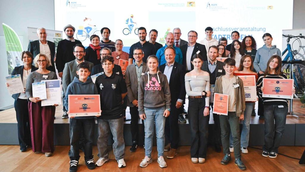 18. November 2024 – Die Aktion STADTRADELN und der Wettbewerb Schulradeln erfreuen sich jedes Jahr großer Beliebtheit. Bei der zentralen Abschlussveranstaltung der Arbeitsgemeinschaft fahrradfreundliche Kommunen in Bayern e.V. (AGFK Bayern) und des Bayerischen Staatsministeriums für Wohnen, Bau und Verkehr im Literaturhaus München überreichten Landrat Robert Niedergesäß, Vorsitzender der AGFK Bayern, und Ministerialdirektor Dr. Thomas Gruber, Amtschef des Bayerischen Staatsministeriums für Wohnen, Bau und Verkehr, sowie André Muno, Geschäftsführer von Klima-Bündnis Services, die Urkunden und Preise an die Gewinnerinnen und Gewinner.
