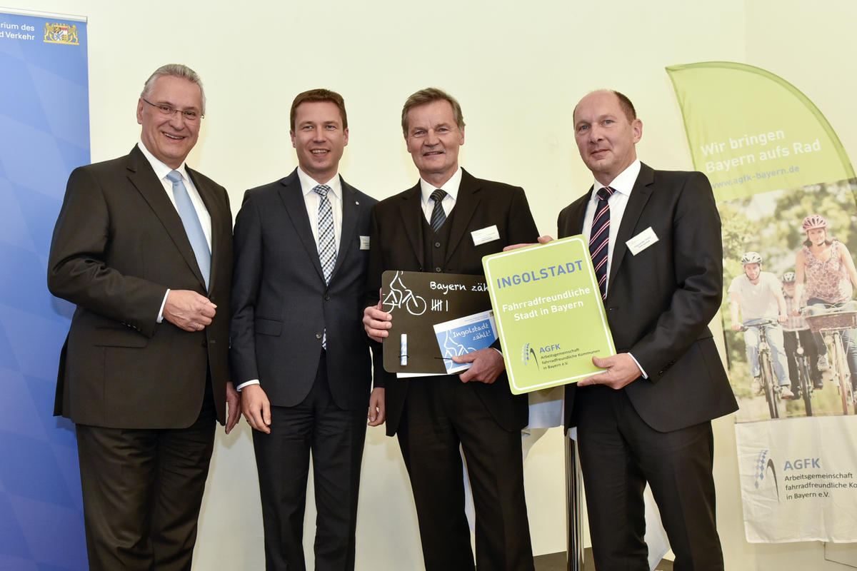 Ingolstadt als „fahrradfreundliche Kommune“ ausgezeichnetBayerns Innen- und Verkehrsminister Joachim Herrmann hat am 24. Oktober 2016 die Stadt Ingolstadt mit dem Zertifikat „Fahrradfreundliche Kommune“ ausgezeichnet. Bürgermeister Albert Wittmann und Baureferent Alexander Ring nahmen die Auszeichnung im Schloss Nymphenburg in München entgegen.