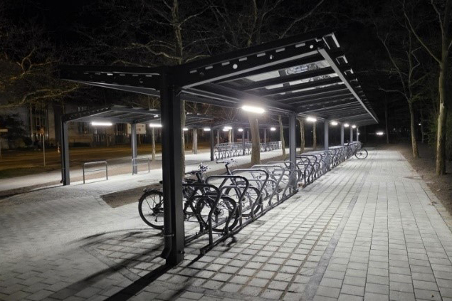 Die beleuchtete und überdachte Radstellanlage bietet komfortable und sichere Einstellmöglichkeiten für den Radverkehr. Sie ermöglicht außerdem gutes und sicheres Absperren der Fahrräder (rahmenabschließbare Fahrradparksysteme).