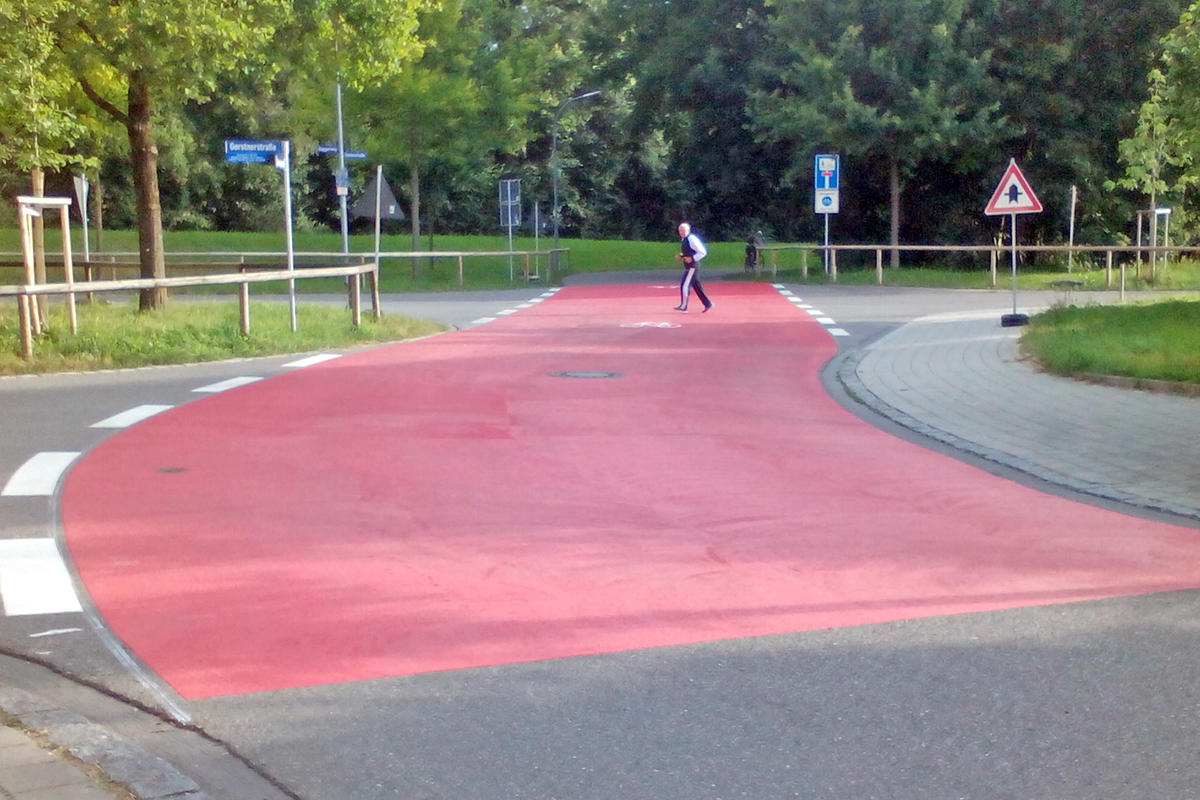 - Sichtbarkeit & Sicherheit: Roteinfärbung mehrerer Radfurten zur besseren Erkennbarkeit an Einmündungen – besonders wichtig, da Radfahrende hier auf einer Vorfahrtstraße unterwegs sind und höhere Geschwindigkeiten erreichen können.