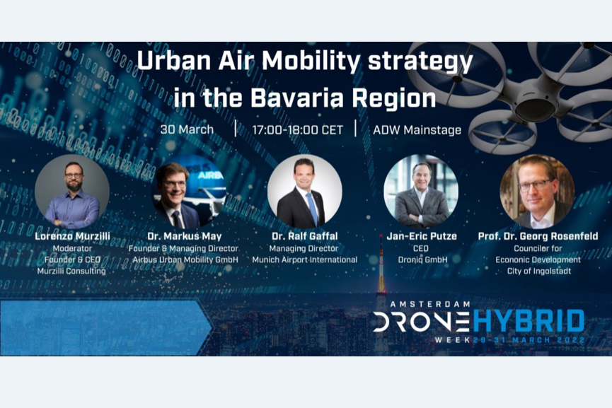 Darüber hinaus vertrat Prof. Dr. Georg Rosenfeld, Wirtschaftsreferent in Ingolstadt, am Mittwoch die Perspektive der Stadt Ingolstadt bei einer Diskussionsrunde zum Thema „UAM Strategie in Bayern“, an der auch Dr. Markus May (Founder & Managing Director Airbus Urban Mobility GmbH), Dr. Ralf Gaffal (Managing Director Munich Airport International) und Jan-Eric Putze (CEO Droniq GmbH) teilnahmen. Die Vertreter tauschten sich über die Zukunft des UAM-Marktes aus und identifizierten die Herausforderungen, die es gemeinsam anzugehen gilt. „Der Erfolg dieser Technik wird nicht zuletzt dadurch bestimmt werden, dass sie für die Nutzerinnen und Nutzer einen Mehrwert stiftet. Als Stadt sind wir früh in das Thema mit eingestiegen, um hier die richtigen Impulse liefern zu können“ so Rosenfeld.